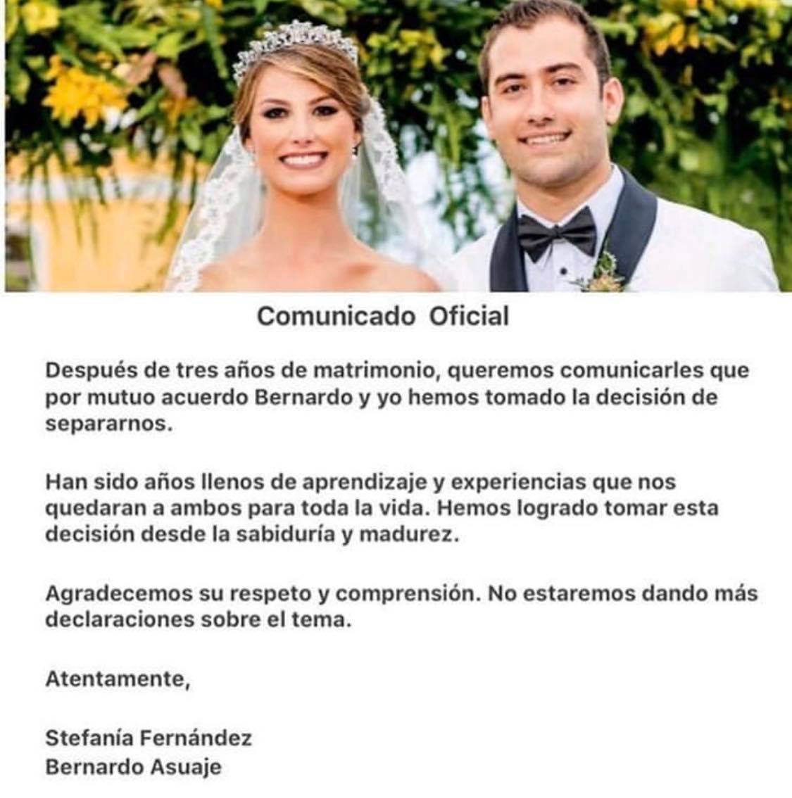 Stefanía Fernández tenía tres años de matrimonio con el empresario, hizo el anuncio oficial a través de un comunicado difundido por su manager Luis Bascarán en Instagram y posteriormente luego ella subió a sus stories.